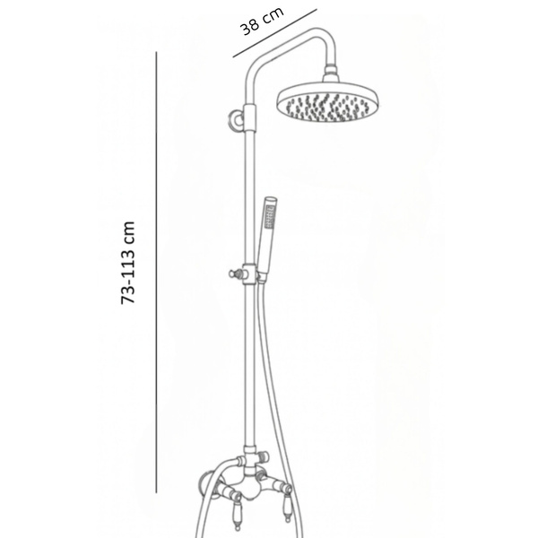 Solidna mosiężna konstrukcja zapewnia trwałość i odporność na korozję. Duża deszczownica gwarantuje komfortowy strumień wody, a ręczna słuchawka umieszczona na ruchomym uchwycie zwiększa funkcjonalność całego zestawu. Montaż natynkowy ułatwia instalację bez potrzeby ingerencji w strukturę ściany.